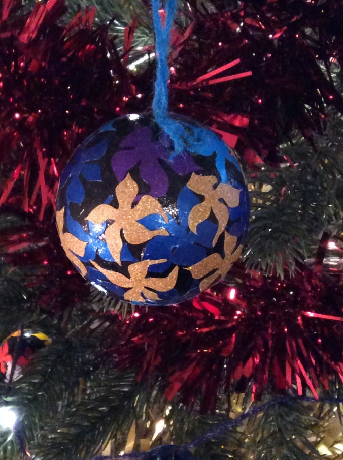 These are made from polystyrene spheres. I’ve covered them with black tissue paper and hand cut papers stars or flowers depending on how you see them. I tend to use a combination of recyled papers and arts quality paper. I’ve found there is something quite meditative about slowly building up layers of paper and glue. Anyway, I think they look nice on the tree.