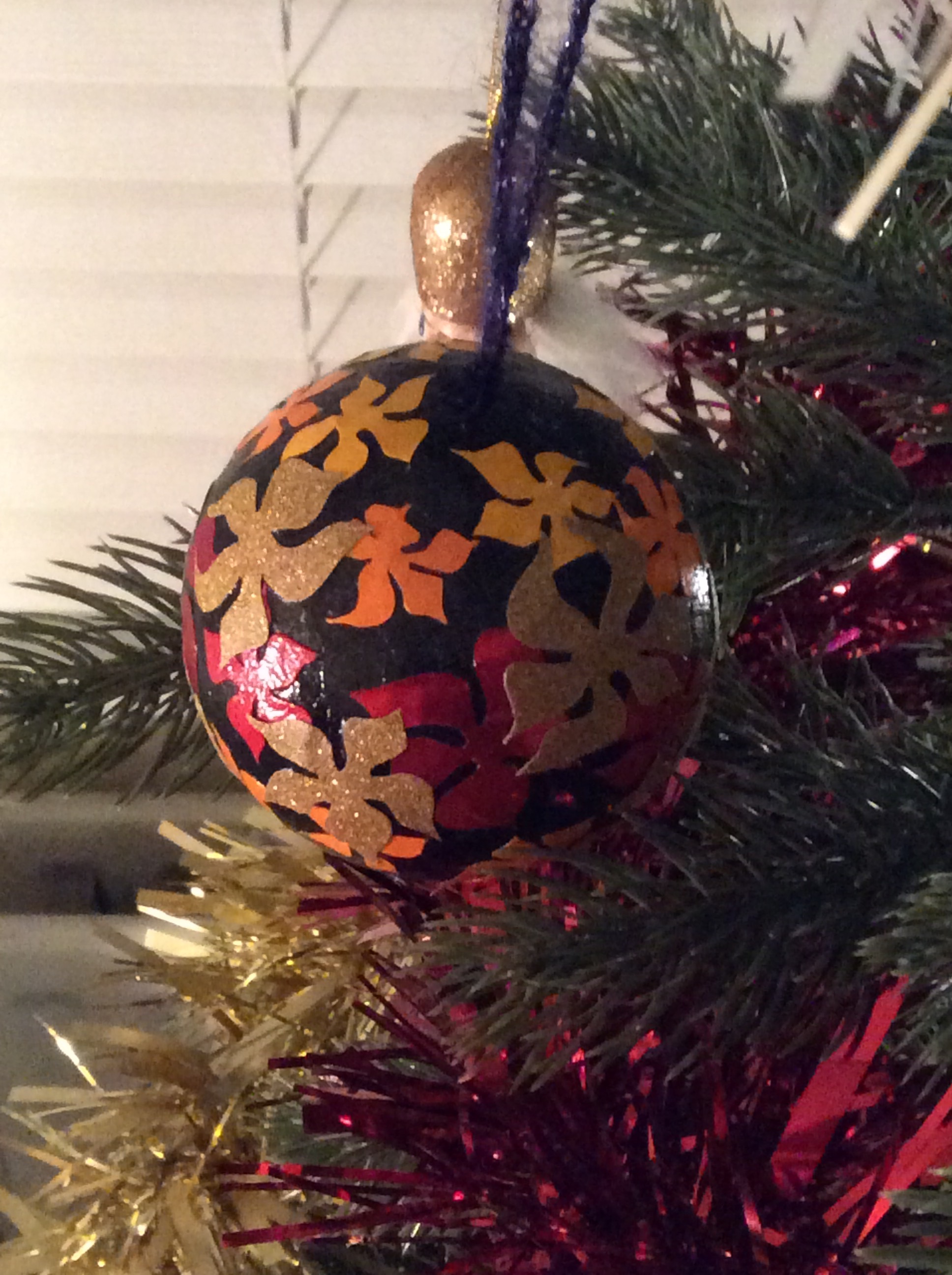 These are made from polystyrene spheres. I’ve covered them with black tissue paper and hand cut papers stars or flowers depending on how you see them. I tend to use a combination of recyled papers and arts quality paper. I’ve found there is something quite meditative about slowly building up layers of paper and glue. Anyway, I think they look nice on the tree.