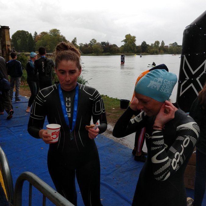 The photo above is of my sister and myself just after finishing the Haver Castle 5km swim last weekend. The water was really cold for us (as fair weather swimmers!) which may have contributed something to my sister whipping round her first 5km in around 1 he 45 mins, and a PB for me at 1 hour 51. Numb toes are a good motivator for a quick finish. The setting at Haver Castle is rather beautiful to look at from out of the water, but it’s not the nicest place to actually swim. It turns out that the lake at Haver Castle is pretty shallow and there is a very thick layer of squidgy mud covering the bottom of the lake. If 50 of people are swimming in front of you (I like to take a slow position at the back, doing breast stroke so I can appreciate the view) they churn the water up so it’s a dirty swim. It’s difficult to get a firm footing on the floor of the lake to adjust goggles, (or cough up some of that dirty water) and too shallow to tread water. I’m glad we did this one but probably won’t rush back to do it again.