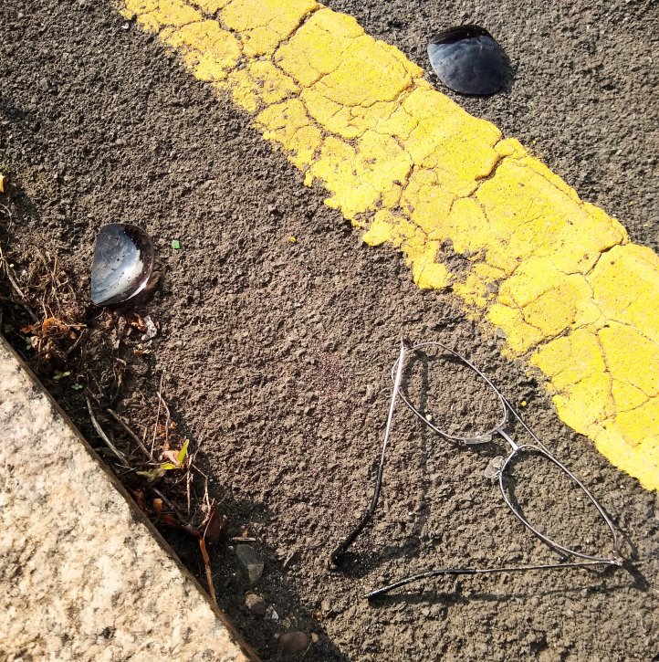 I first saw this broken pair of sunglasses on the road a day before I took the photo. My initial response was that they weren’t that interesting to me, but then when I found myself thinking about them a bit later in the evening knew that they had caught my attention after all. When I went looking for them the next day I was relieved that they were still there, but they were not arranged as I remembered.