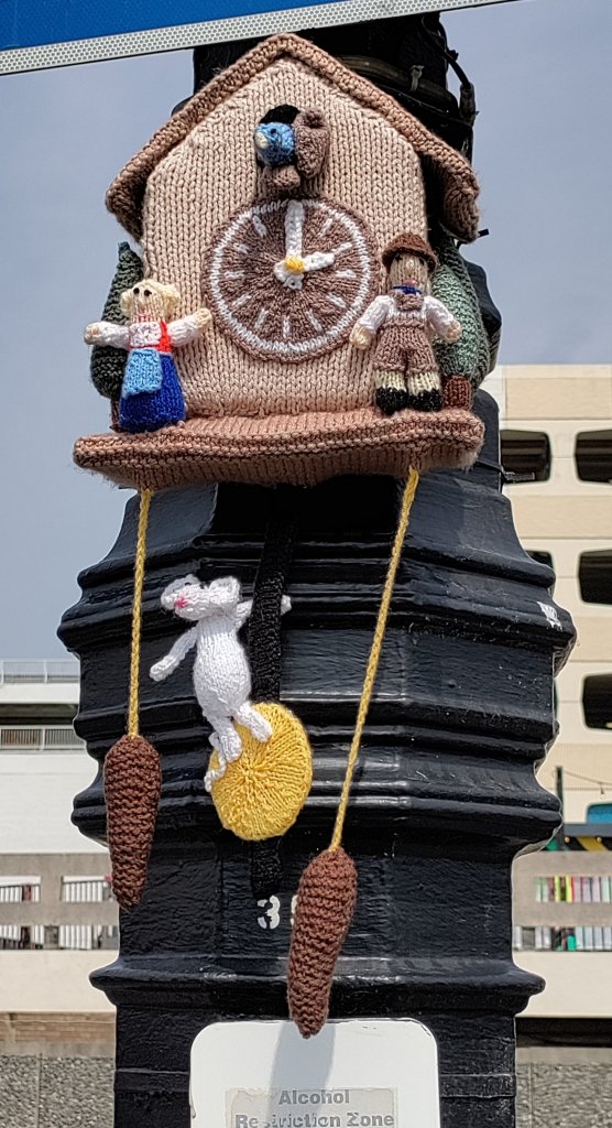 A few weeks ago my little family and I took a holiday by the seaside in the town of Worthing, East Sussex. While we were there I noticed quite a few little pieces of knitted art like this clock that we saw fixed to a lamp post. Most of them were fixed to various spots along the promenade at the sea front, which is a popular public space even when the air is cold, windy and flecked with rain.