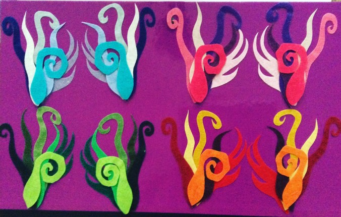 When not in work I have found myself drawn to a more physical existence. Pottering in the garden, making sure everything has had enough water in our uncharacteristically hot summer, and picking courgettes, which seem to be doing well while everything else wilts. Swimming in the Serpentine Lido. Drawing with pencils on paper. Cutting up bits of cloth (soaked in watered down glue to prevent the edges fraying) and paper into new shapes. Arranging and rearranging things so experiment with different forms and colours. Anything that I can touch with my hands, anything with texture.