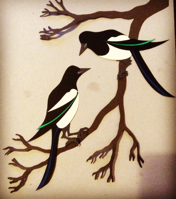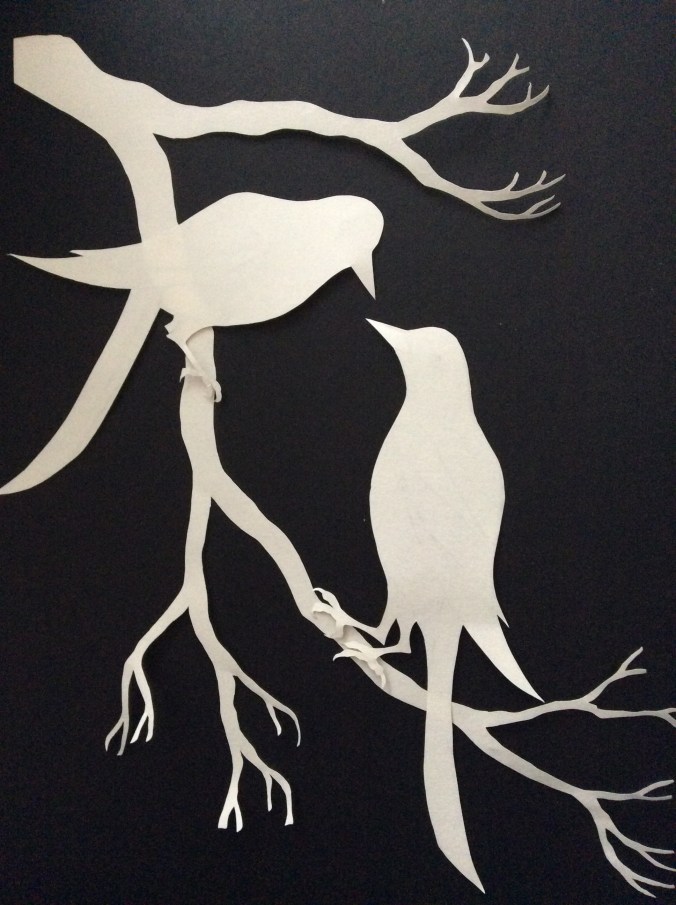 I moved on to paper cutting after seeing an exhibition in the Tate Modern by Matisse. His late work included very large organic shapes cut from large vibrantly coloured pieces of paper. To begin with I was interested in the different silhouettes I could create using bold and contrasting colours. More recently I have been exploring different textures and patterns, including using cloth that has been coated in PVA glue. My practice continues to evolve.